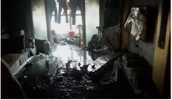 事发时该住户家中共有2人,客厅电视机、空调、天花板、橱柜等被火势损坏。