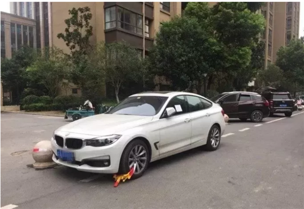 一辆宝马车被物业上锁