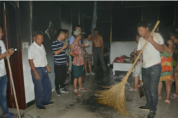 民警立即切断起火房屋的电源,一组民警架设水管灭火,另外一组民警从附近居民家中借来水桶、水盆就近取水灭火。闻讯赶来的村民也投入到火灾扑救中,经过10分钟的努力,明火基本扑灭。