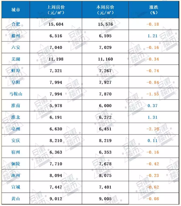 1、数据显示,本周12城房价出现下跌,下跌城市为合肥、六安、芜湖、蚌埠、阜阳、马鞍山、亳州、宿州、铜陵、池州、宣城、黄山,其中下跌幅度最大的城市为亳州,而阜阳下跌了67元/㎡,跌幅为0.84%。